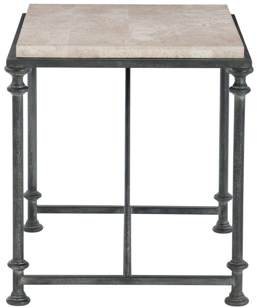Laminated honed Travertine Stone top. Solid and tubular steel base and stretchers in Antique Silver finish. Adjustable glides.