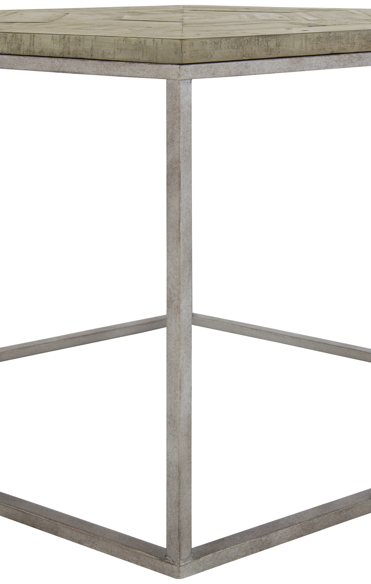 Hexagonal shaped, planked fancy face top in Morel finish. Tubular steel frame in Glazed Silver finish. Adjustable glides.