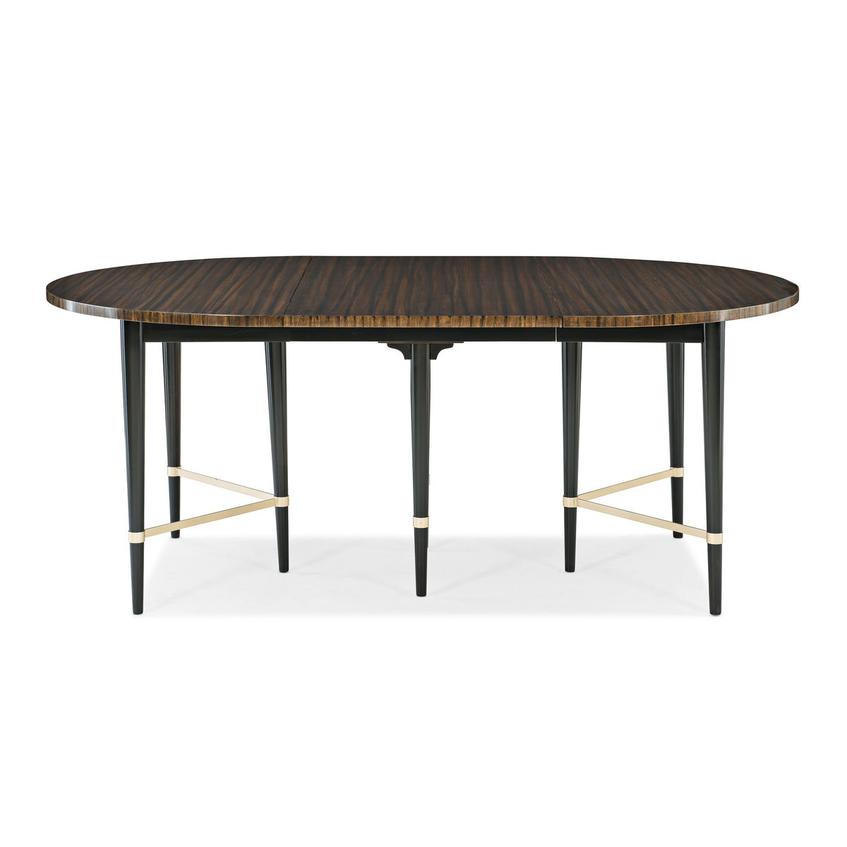 For gatherings small or large, this bold statement-making dining table will sweep you off your feet. Its contemporized traditional profile is designed to accommodate groups from four to 12. Stunning quartered Paldao wood distinguishes the tabletop and is finished in a rich shade of Saddle while a deep Black Saddle finish adds depth to its legs and apron. A Neutral Metallic highlights its stretchers for an added element of glamour. As your party grows, this impressive table can be extended to 3.65 metres with the addition of four 61 centimeter leaves.