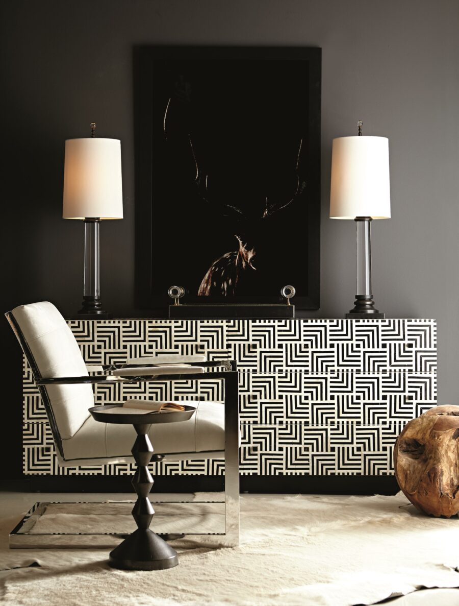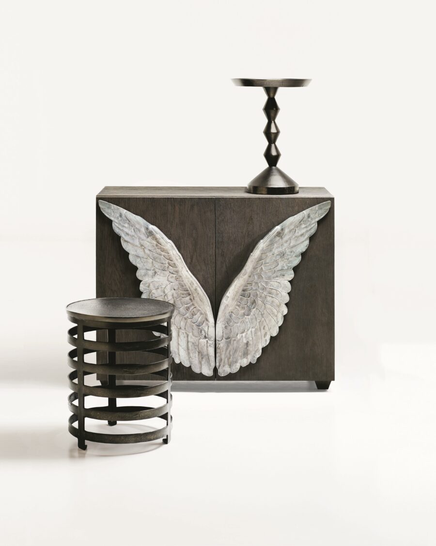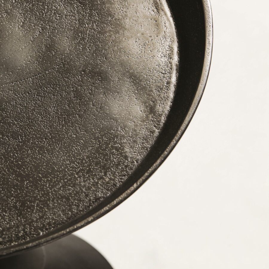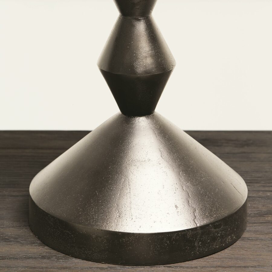 Fine craftsmanship, unique materials, and modern styling characterize the Bernhardt Interiors collection. A jewel of a table with eclectic roots, the Mirabelle round chairside table connects a sculptural pedestal to a conical base and deep gallery top. Crafted from cast aluminum in black nickel finish, this elegant accent table delivers texture, shine and a touch of industrial chic.