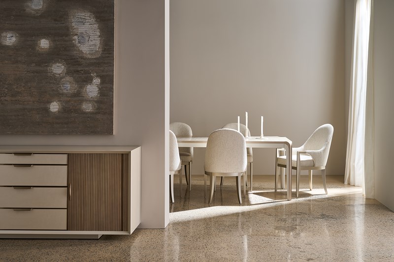 refined. Accented by the welt, its simple silhouette is beautifully balanced on an exposed wood frame and tapered legs in Soft Silver Paint. Expertly tailored in an Ecru shimmer woven fabric that’s durable and easy to clean. Pair with a desk to elevate working from home.