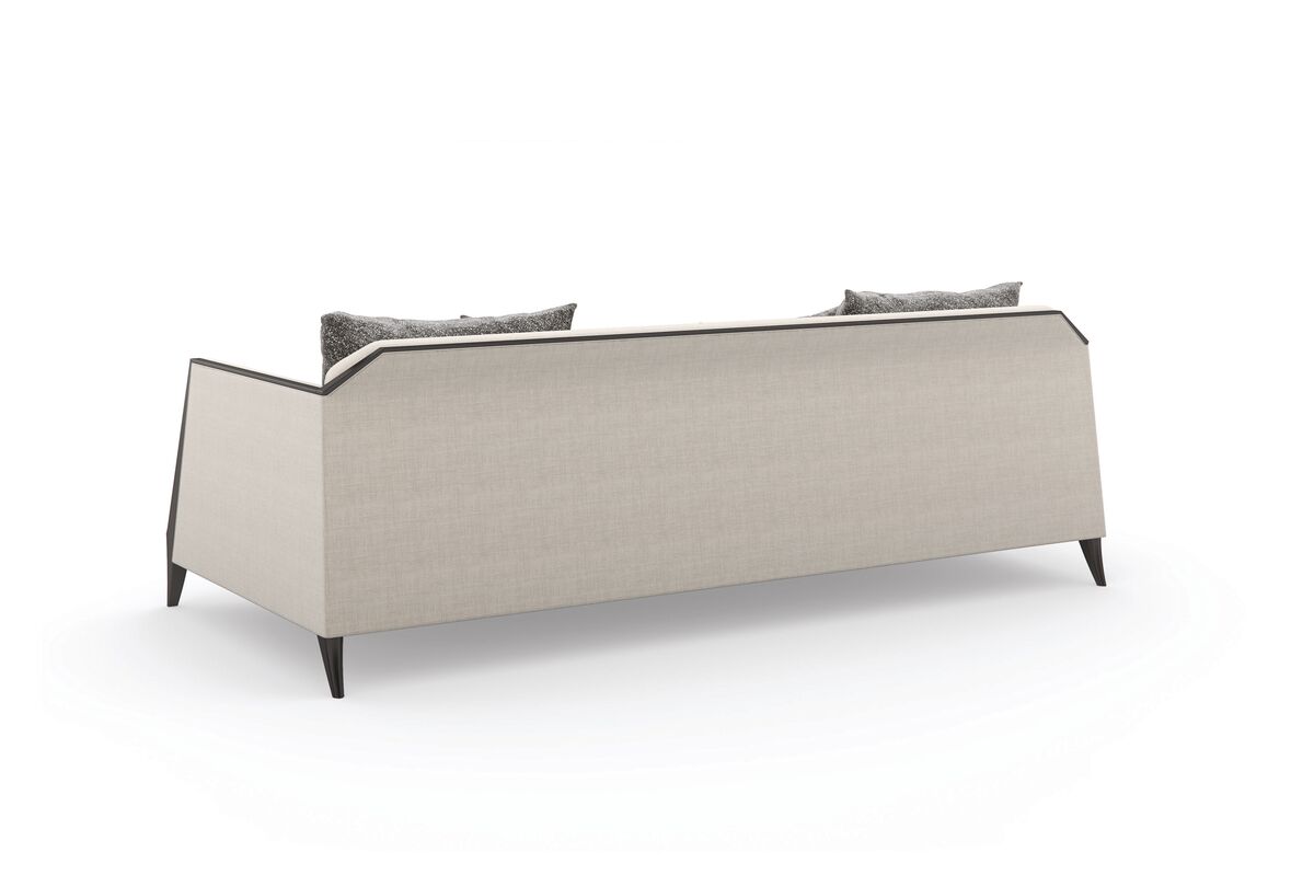 Statement-making from every angle, this modern sofa features a striking silhouette, distinctly defined by continuous clean lines and a slim wood frame. Tailored to perfection in a woven linen fabric, its smooth upholstered back and welted seat cushions offer soft contrast to its Black Saddle finish. Poised on French cabriole-inspired legs, it offers sophistication, with cloud-like comfort. Accent pillows add depth and warm texture in a multicolor velvet. Style with a pair of matching Outline chairs.