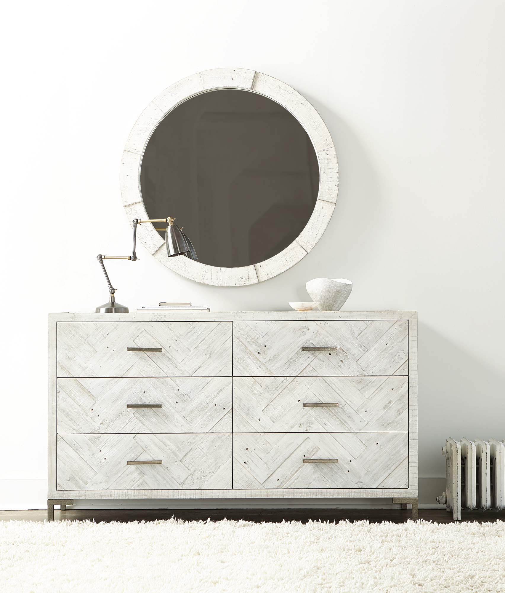 Planked frame of varying thickness in Brushed White finish. Non-beveled mirrored glass. Note: Due to weight, must be hung on stud.