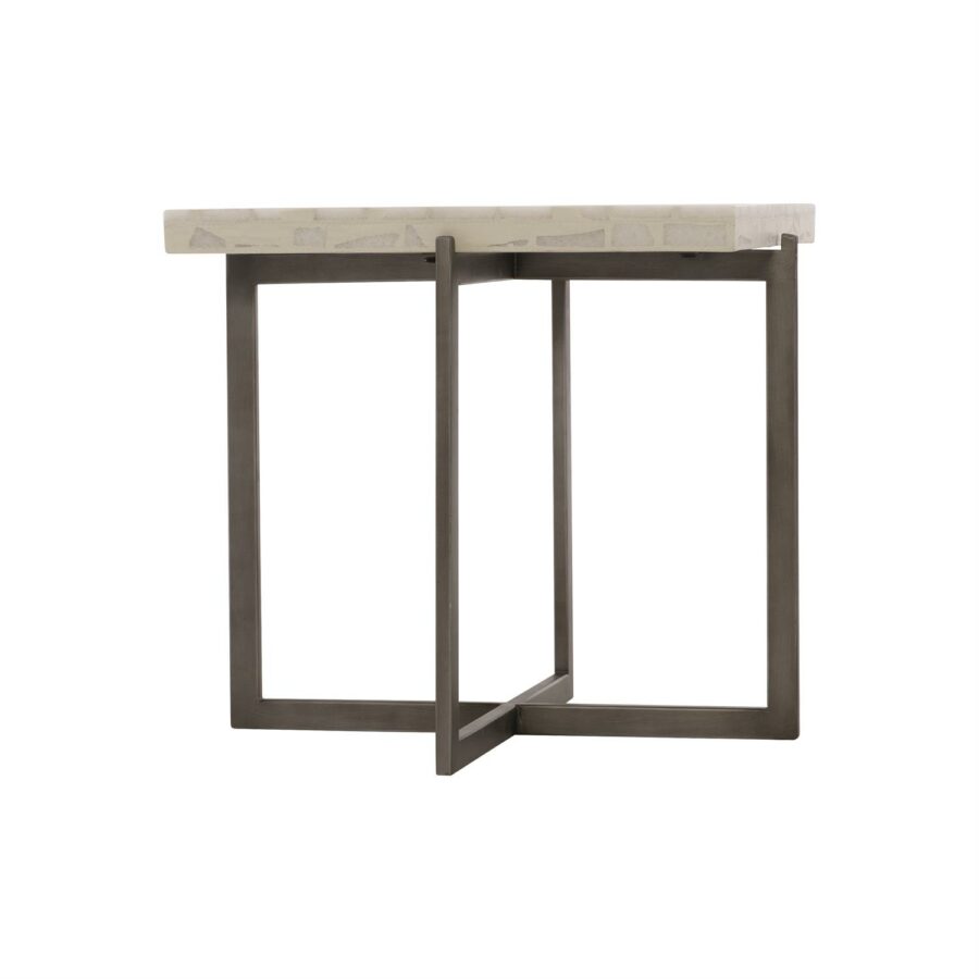 Characterized by exceptional luxury and sophisticated design, Bernhardt Exteriors offers a selection of elegant yet durable accent tables. This classically inspired cocktail table will liven up any outdoor space with its terrazzo stone top and sleek stainless-steel base. The linear frame and creative pairing of materials deliver a modern, organic look.