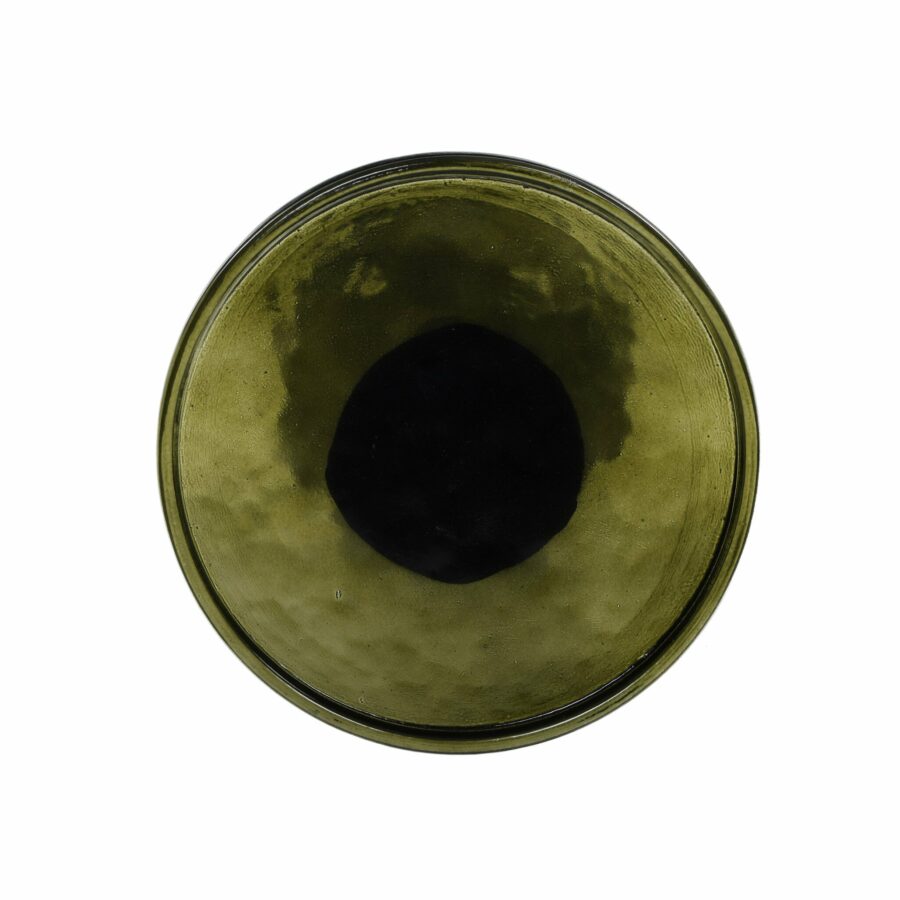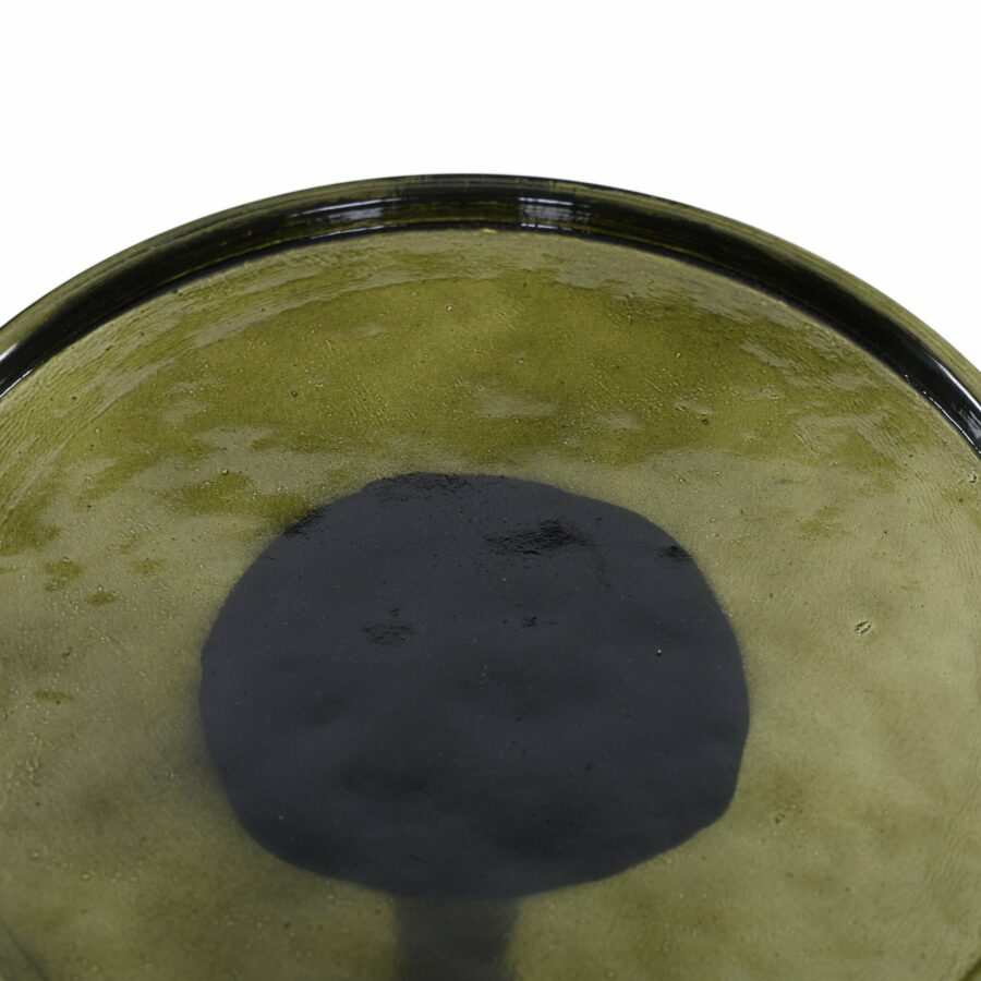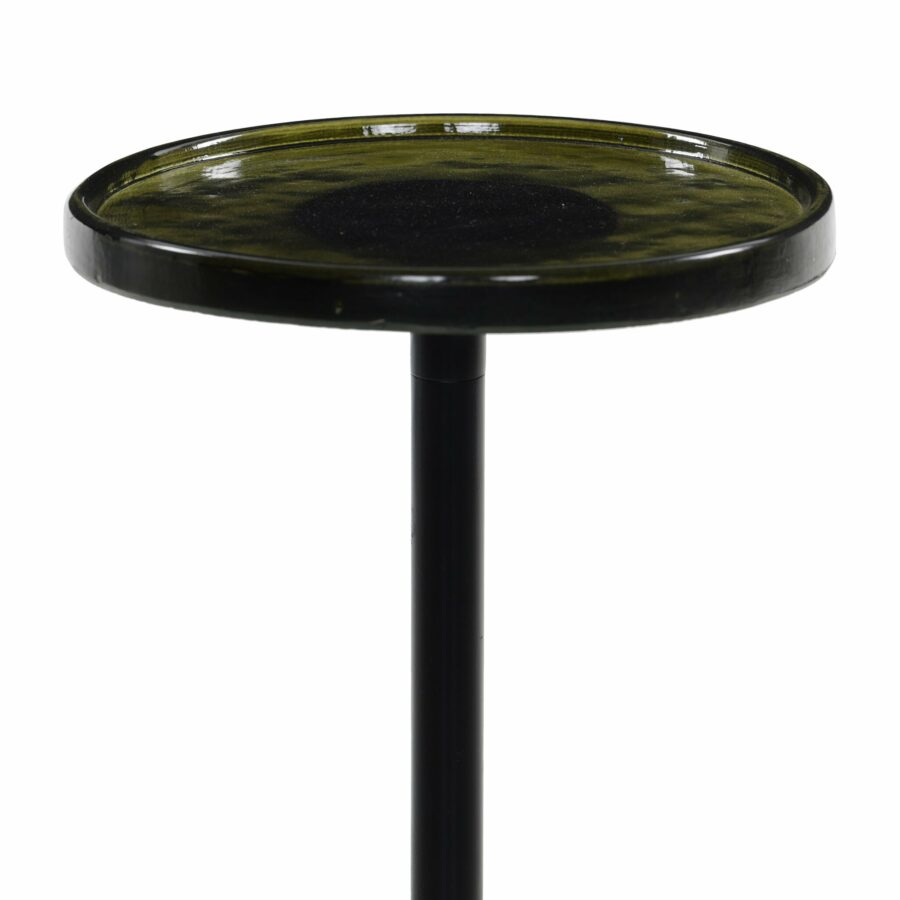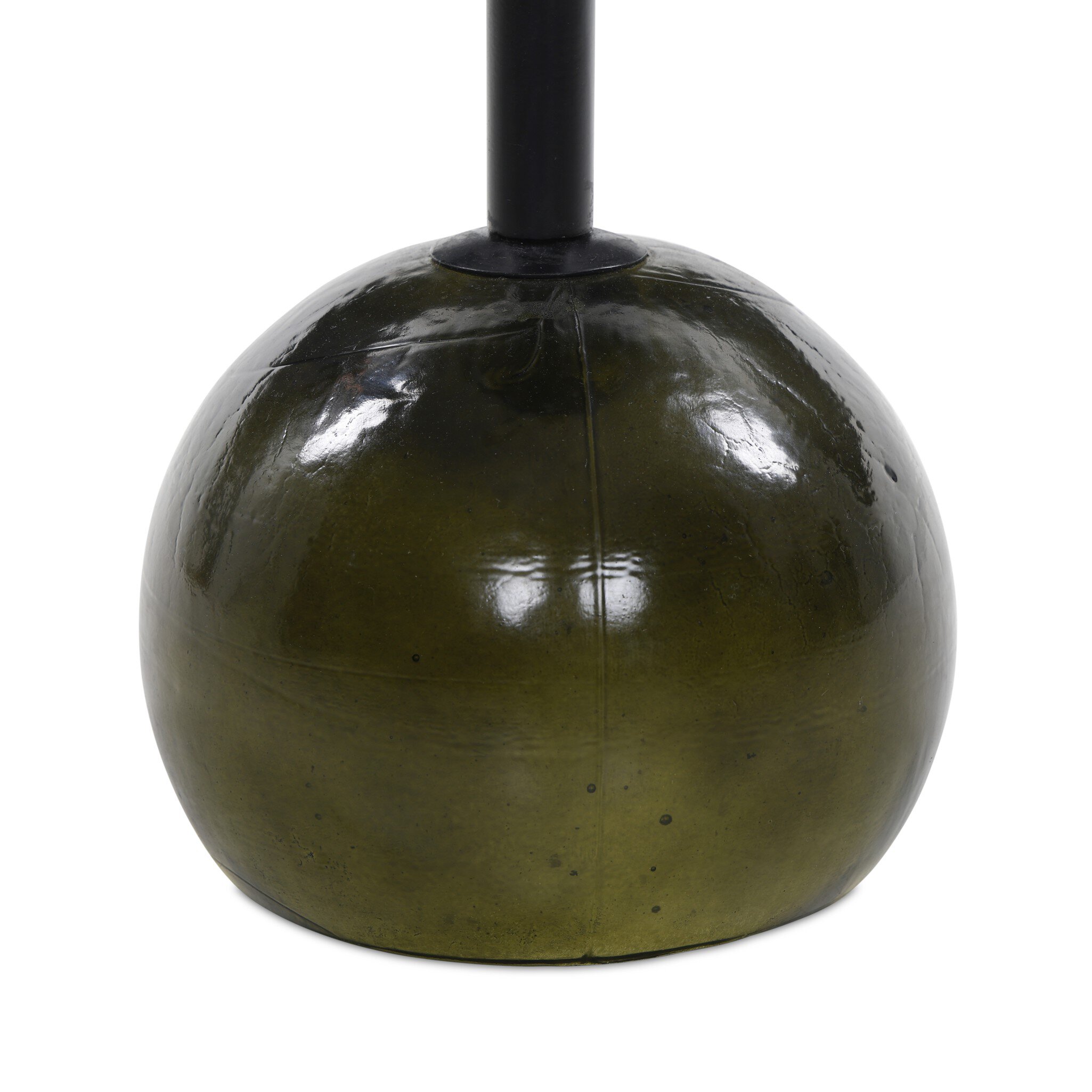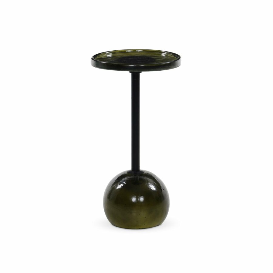 A sphere-shaped base of amber cast glass supports slim, black-finished iron piping and a tray-style tabletop that’s perfectly sized to keep your favorite book or nightcap within reach.