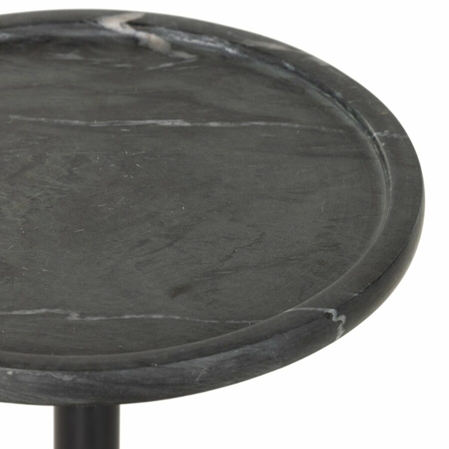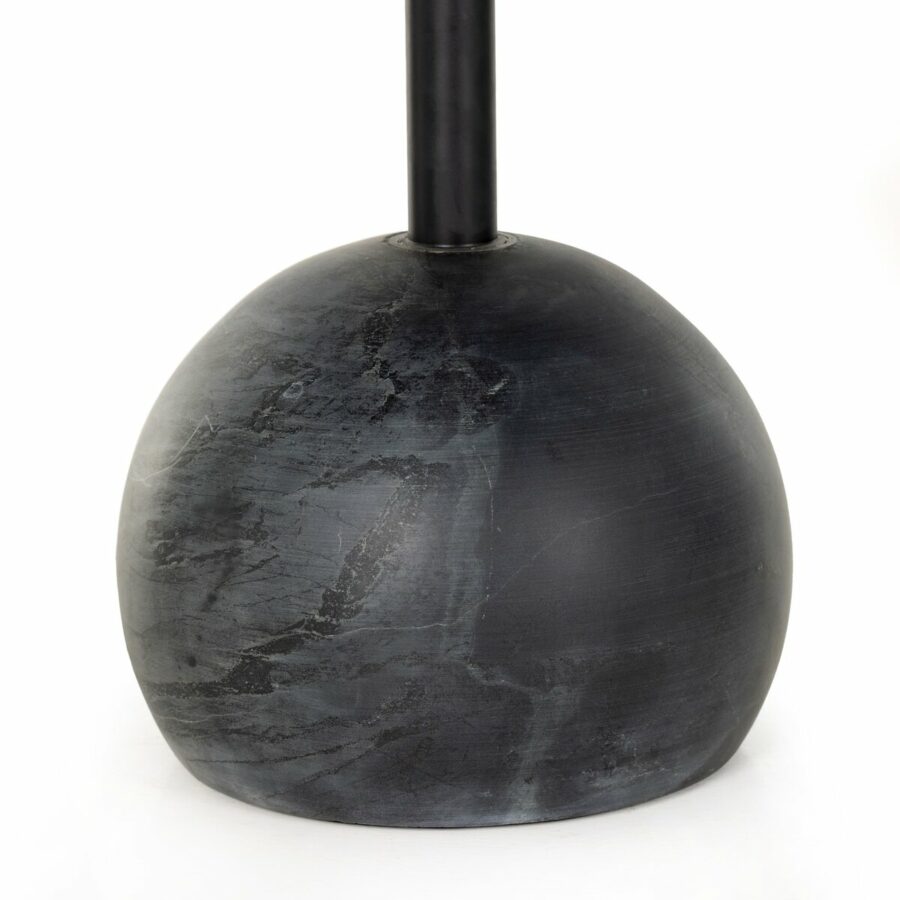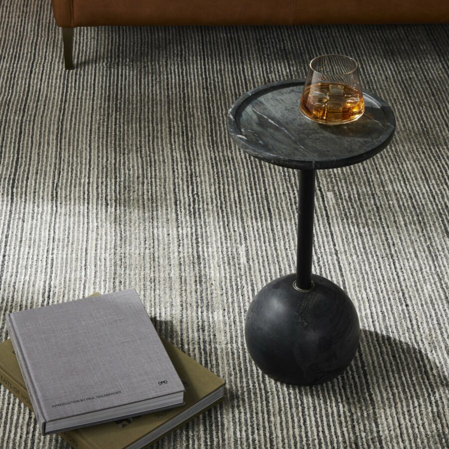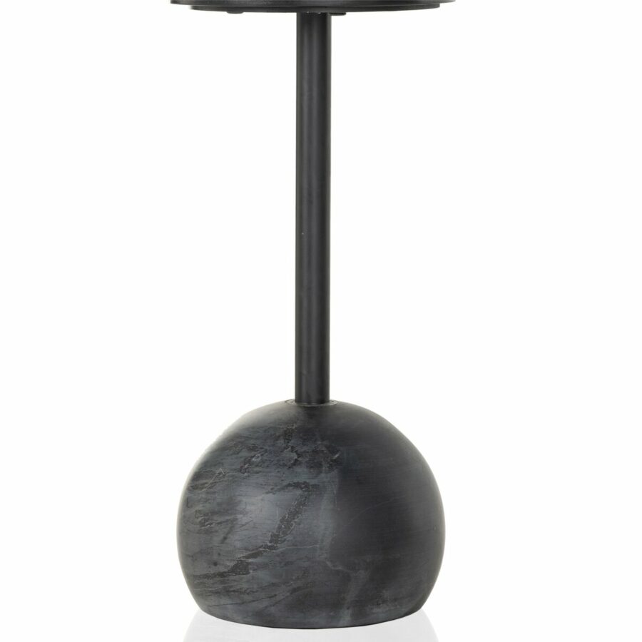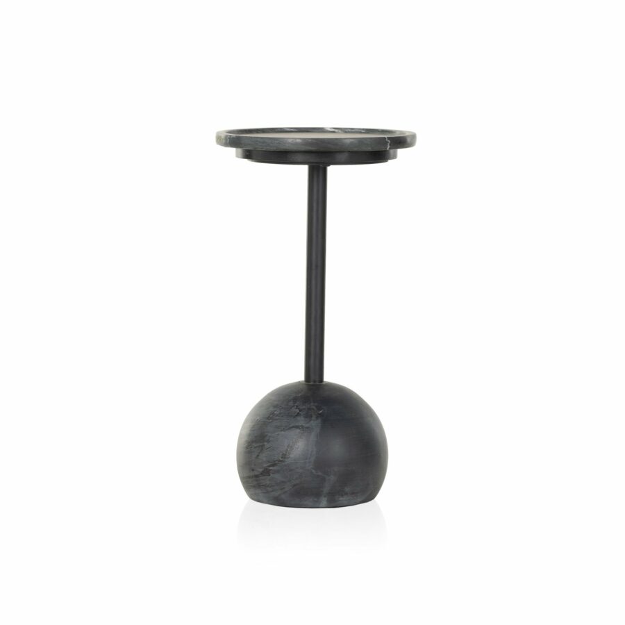 A sphere-shaped base of amber cast glass supports slim, black-finished iron piping and a tray-style tabletop that’s perfectly sized to keep your favorite book or nightcap within reach.