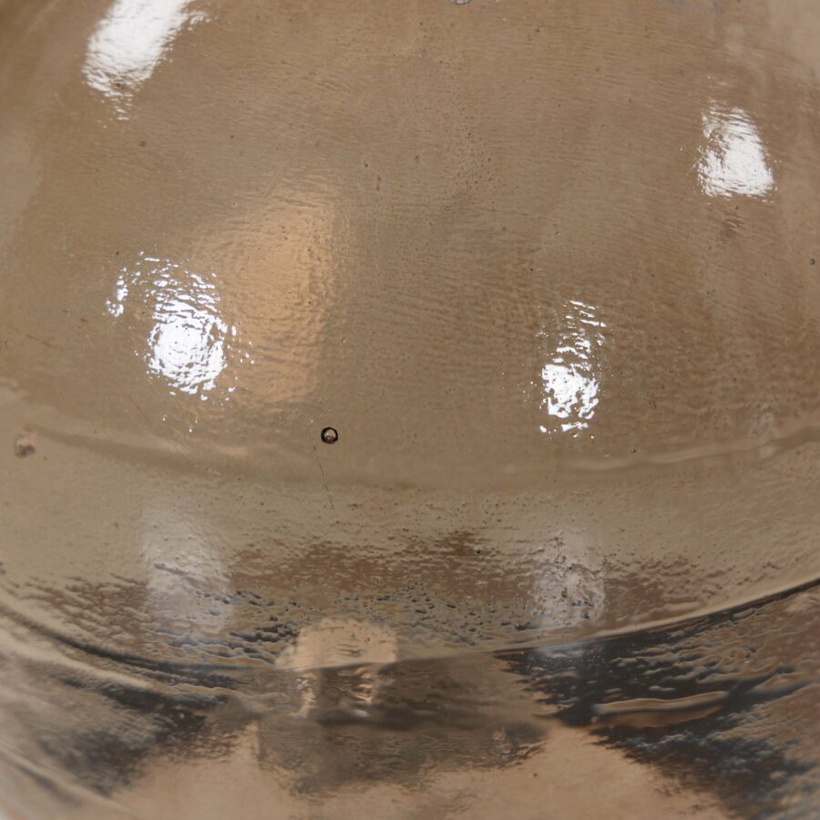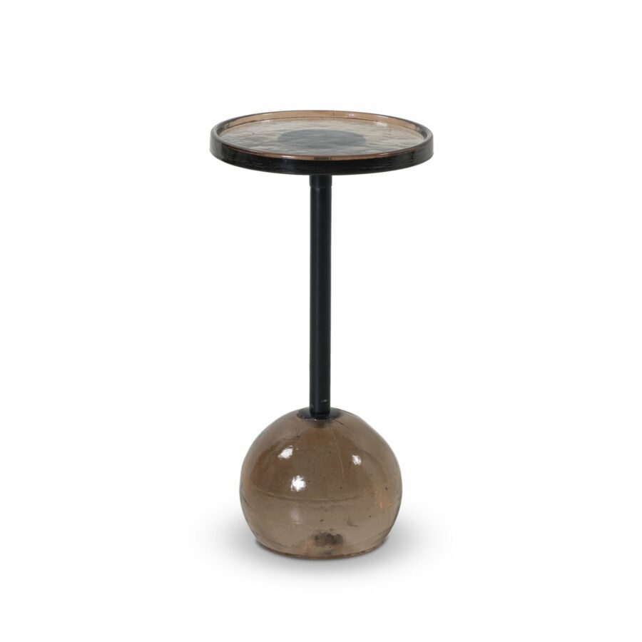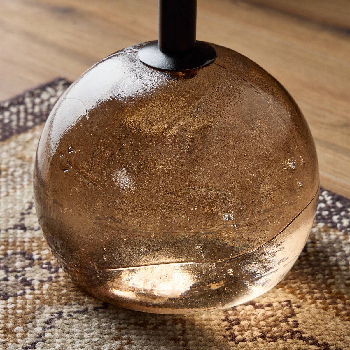 A sphere-shaped base of amber cast glass supports slim, black-finished iron piping and a tray-style tabletop that’s perfectly sized to keep your favorite book or nightcap within reach.